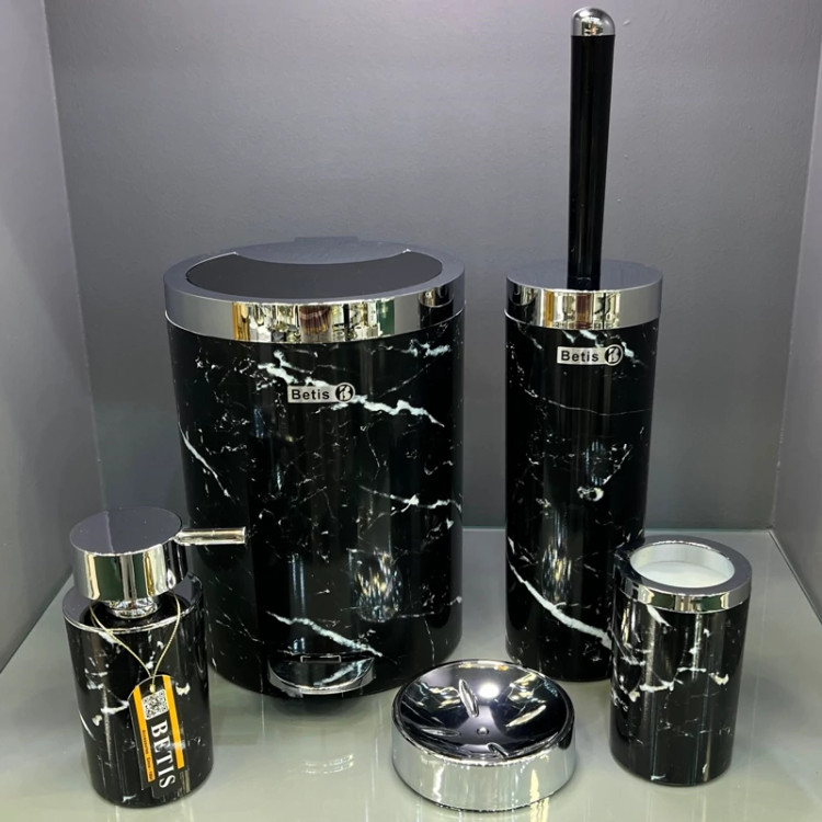 شامل : سطل و فرچه و جامایع و جامسواک و جا صابون سرویس پنج پارچه ماربل مشکی کروم ⭐️