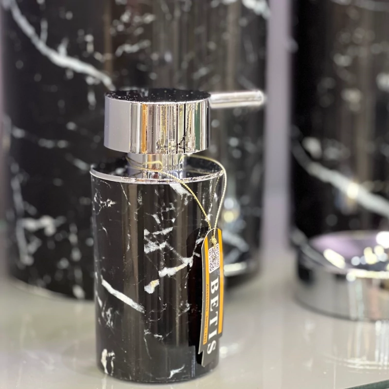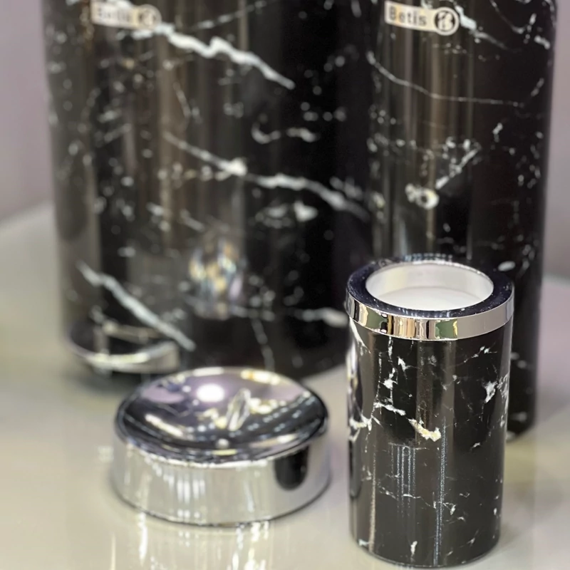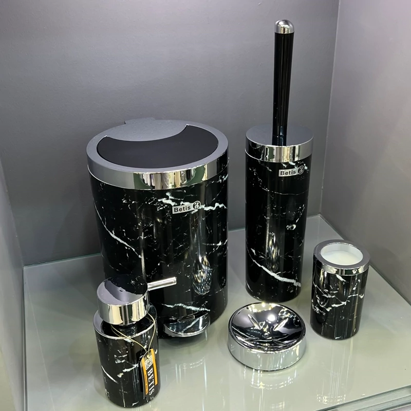 شامل : سطل و فرچه و جامایع و جامسواک و جا صابون سرویس پنج پارچه ماربل مشکی کروم ⭐️