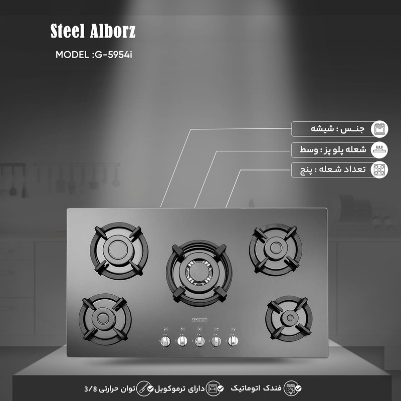 شرکت صنایع استیل البرز پس از سالها تجربه در صنعت تجهیزات آشپزخانه و دارنده استانداردهای ایران و CE اروپا، محصولات خود را در بازارهای داخلی و بیش از 40 کشور جهان از جمله خاورمیانه، خاور دور، کانادا، جنوب آفریقا، اقیانوسیه و اروپا عرضه میکند که این خود نشان از کیفیت بالای محصولات این شرکت است. اجاق گاز صفحهای شیشه مدل G-5954i یکی از اجاق گازهای توکار این شرکت و محصولی پنج شعله است که با برخورداری از شعلههای کوچک و بزرگ، امکان استفاده از ظروف مختلف را به شما میدهد. برای استحکام و طول عمر بالای این مدل از شیشههای نشکن سکوریت با تحمل درجه حرارت 300 درجه سانتیگراد استفاده شده است. این اجاق گاز دارای ترموکوپل فوق سریع بوده و تجهیزات گاز سوز آن تماماَ با کیفیت درجه یک است. توان حرارتی بالای شعله های آن (پلوپز 3.8KW، چپ جلو 1/75KW، چپ عقب 3KW، راست جلو 1KW، راست عقب 1/75KW) پخت سریعتری را برای شما به ارمغان میآورد.