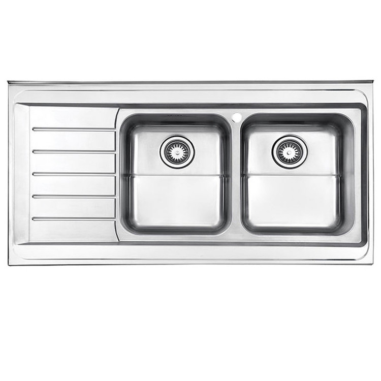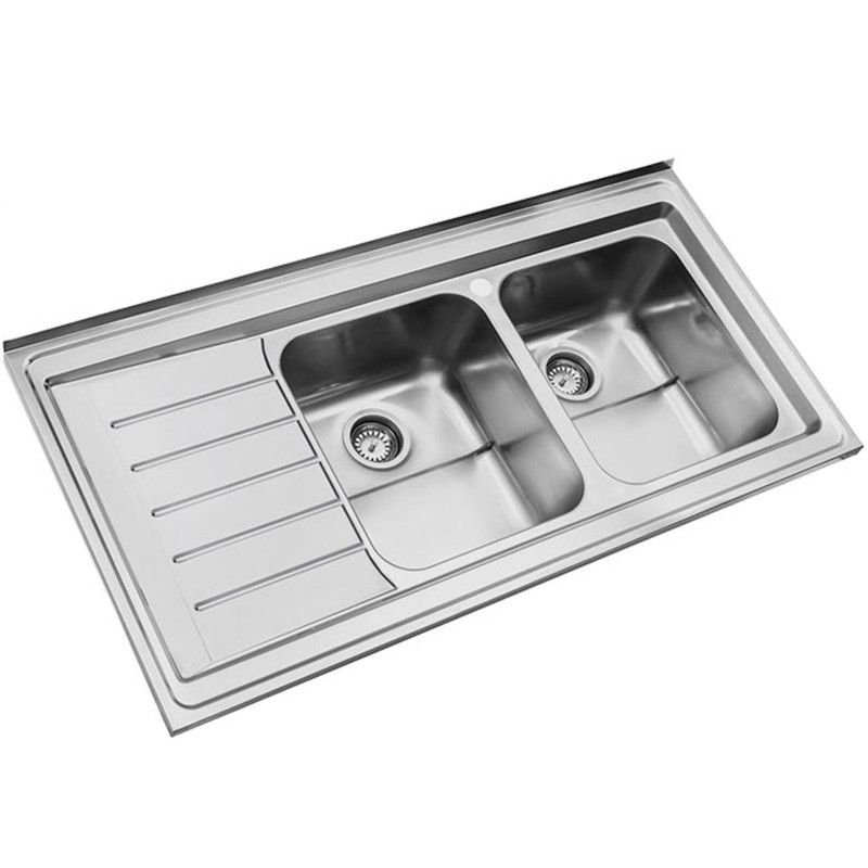 ابعاد سینک : طول 120 سانتیمتر و عرض 60 سانتیمتر است مدل محصول : سینک ظرفشویی استیل البرز 735 روکار – steel alborz داری لگن چپ و لگن راست به انتخاب مشتری میباشد عمق لگن بزرگ : دارای لگن عمیق با عمق 20 سانتی متر است لوازم جانبی همراه: تخته ساطور , سبد , سیفون است