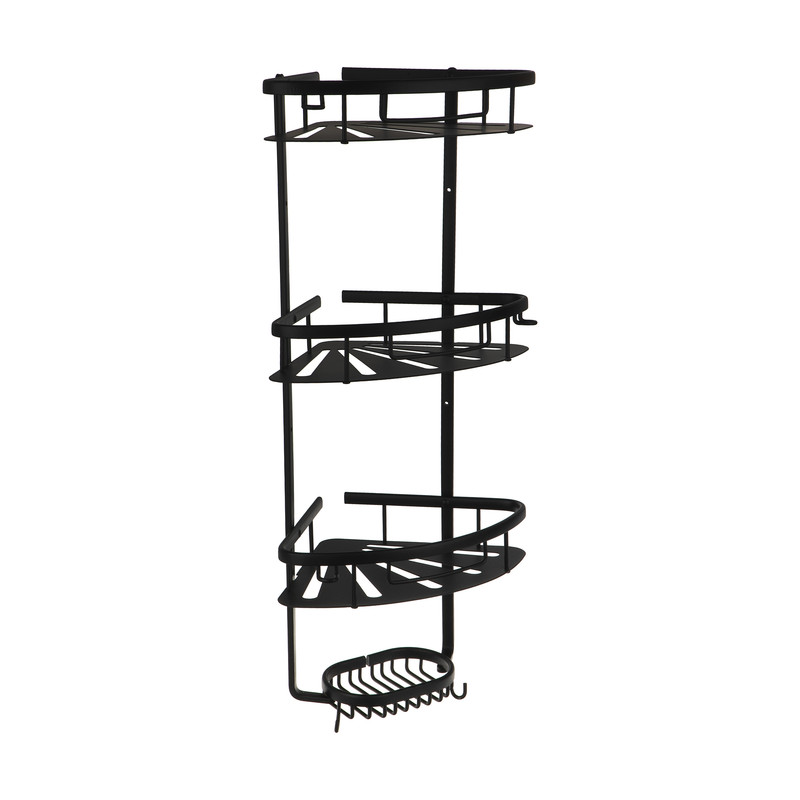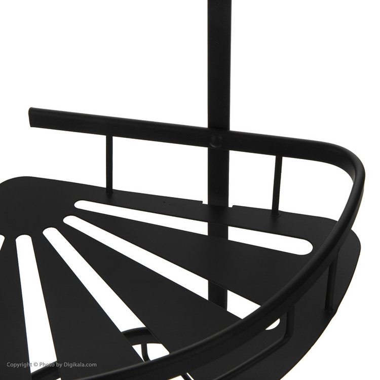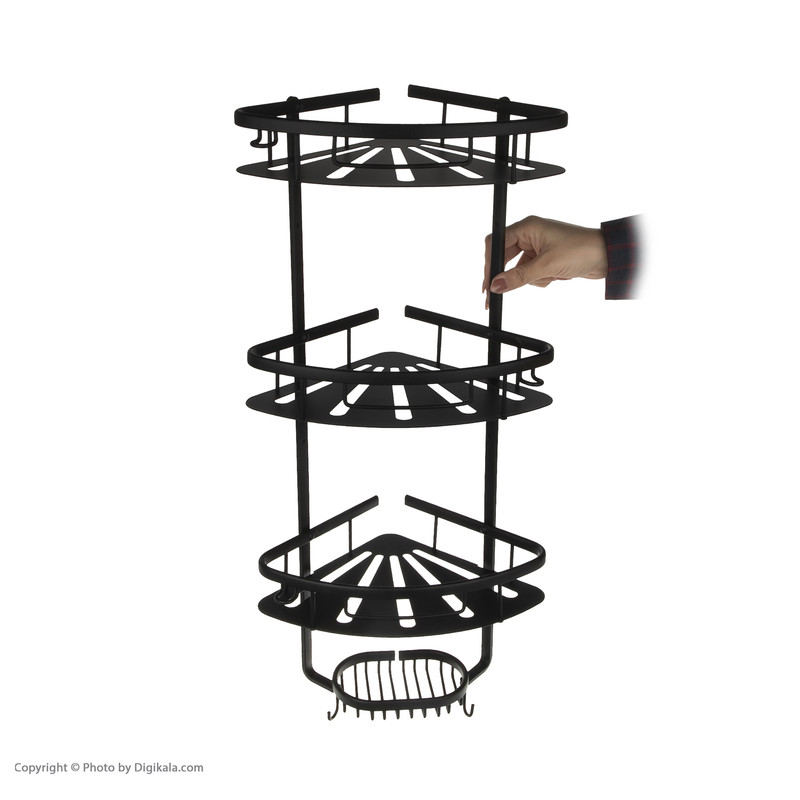 فسه حمام مدل کنج 3 طبقه از جنس آلومینیوم بوده و به هیچ عنوان زنگ نمی زند و لکه آب روی آن نمی نشیند که این موضوع را میتوان از مزایای بارز محصولات آلومینیومی دانست. این محصول برخلاف نمونه های مشابه قطر صفحات قفسه ها ضخیم که باعث استحکام و ثابت نگه داشتن مواد شوینده روی آن می باشد. مات نمی باشد و در فرآیندی شیمیایی براق می شود که این مهم باعث ست شدن این محصول با انواع اکسسوری های موجوددر بازار می شود. سبک، زیبا و بادوام می باشد. سه قلاب در بالا و دو قلاب در پایین برای آویزان کردن لیف و ژیلت روی این قفسه حمام تعبیه شده است. این محصول دارای سه طبقه با صفحه های مشبک برای گذاشتن شامپو و دیگر وسایل و یک طبقه در پایین مخصوص صابون می باشد. مزیت این محصول نسبت به نمونه های میله ای، ایستایی بیشتر وسایل قرار داده شده در آن می باشد که به جهت تخلیه آب، از صفحات مشبک استفاده شده است. ( در محل جا صابونی به علت جلوگیری از خمیر شدن صابون از میله به جای صفحه استفاده شده است). لبه های بلند طبقات این محصول مانع افتادن شامپو و وسایل دیگر می شود . به همراه این محصول چهار عدد پیچ و رول پلاک و درپوش پلاستیکی برای اتصال قفسه به دیوار ارائه می شود. در بدنه قفسه محل لازم جهت عبور پیچ اتصالی به دیوار تعبیه شده است.