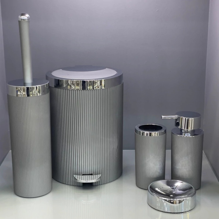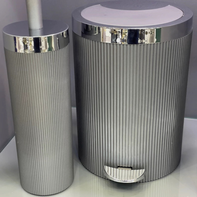 شامل : سطل و فرچه و جامایع و جامسواک و جا صابون سرویس پنج پارچه ایکیا طوسی کروم ⭐️ فوق العاده خاص و شیک برند بتیس💥 جنس ای بی اس کاملا نشکن✅ رنگثابت آبکاری شده با پی وی دی✅ درب بادبزنی و پدالی (آرامبند)✅